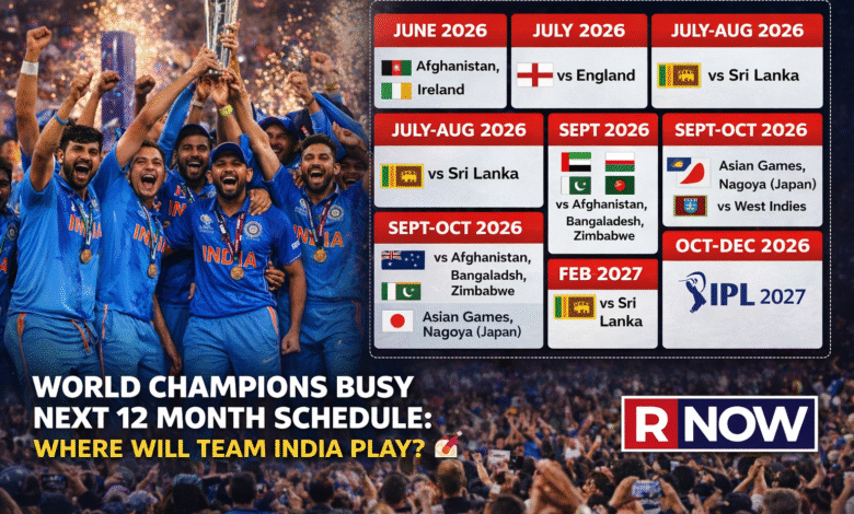 टी20 वर्ल्ड कप 2026 जीतने के बाद टीम इंडिया का शेड्यूल बेहद व्यस्त होने वाला है। अगले 12 महीनों में भारत अफगानिस्तान, इंग्लैंड, श्रीलंका, न्यूजीलैंड और वेस्टइंडीज समेत कई टीमों से भिड़ेगा। जानिए पूरा कैलेंडर।